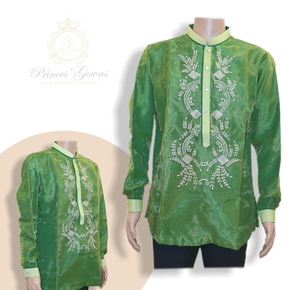 This men’s barong features a fresh apple green hue, giving a modern twist to a traditional piece. Made with organza fabric and full lining, it offers comfort while maintaining its formal look. Designed with a Mandarin collar, long sleeves, embroidery, and button closure, it’s perfect for weddings, cultural events, and formal occasions.