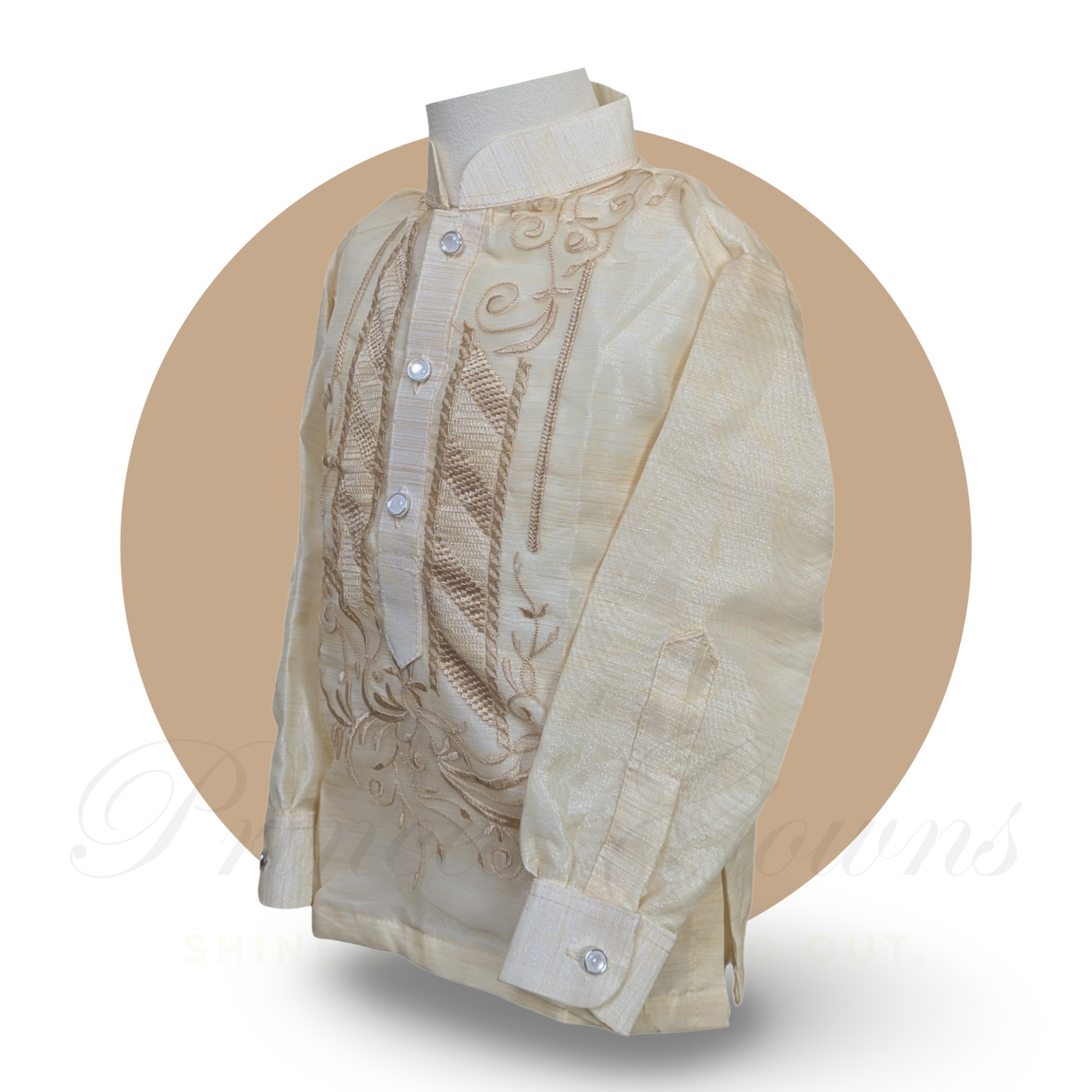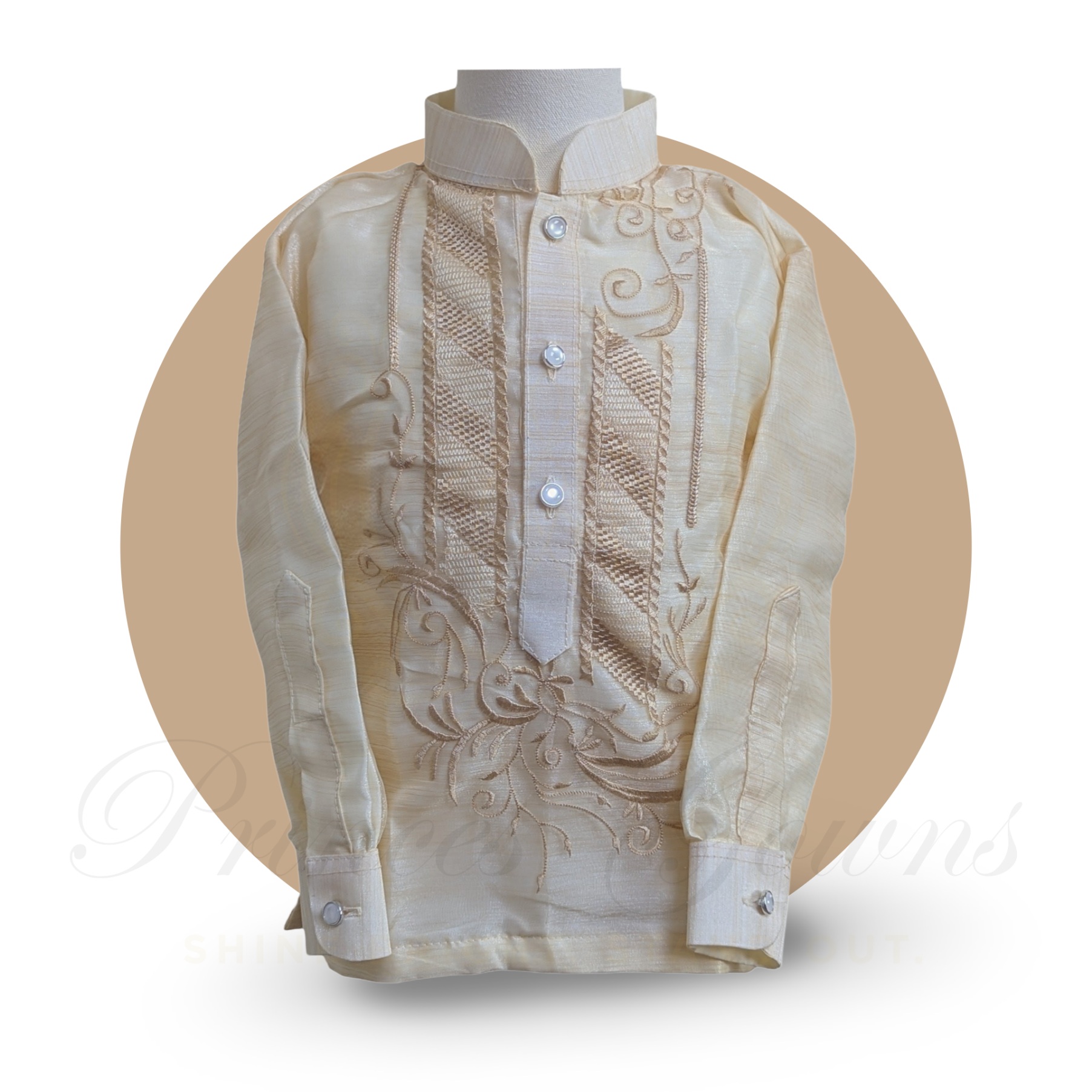 Classic ivory organza Barong for boys with embroidery, lightweight and perfect for formal and cultural events.