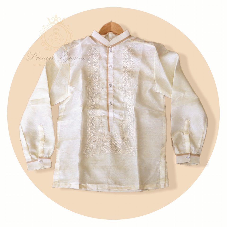 Ivory with cream embroidery men’s barong in lined organza, Mandarin collar, and long sleeves, size XL.