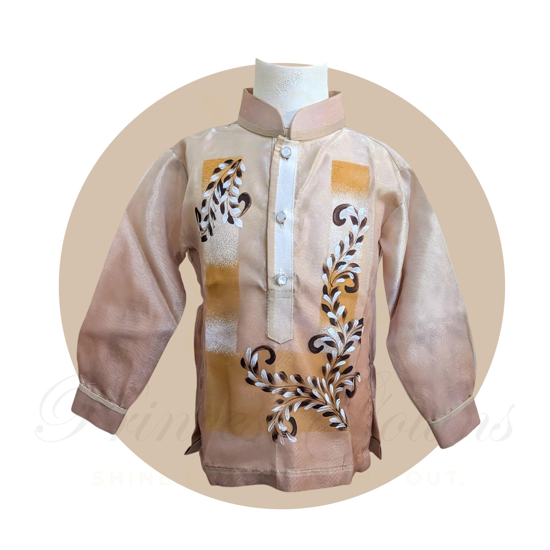 Classic brown organza Barong for boys with embroidery, lightweight and perfect for formal and cultural events.