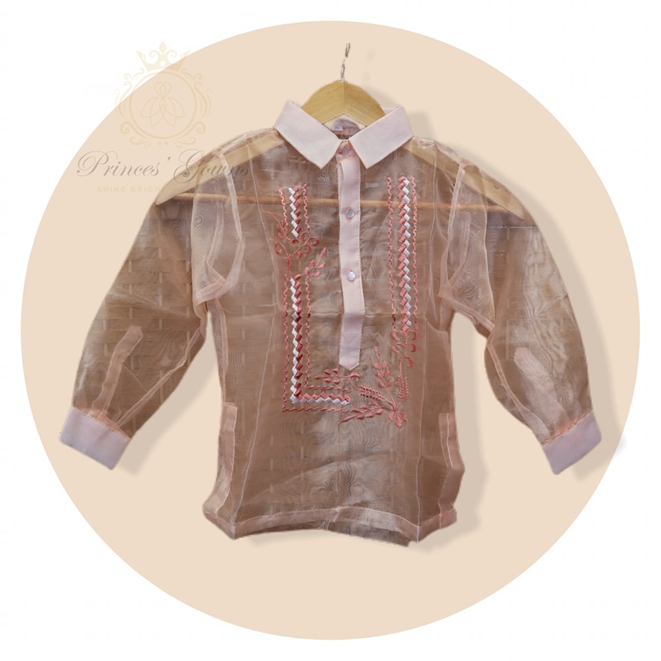 Classic peach organza Barong for boys with embroidery, lightweight and perfect for formal and cultural events.