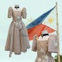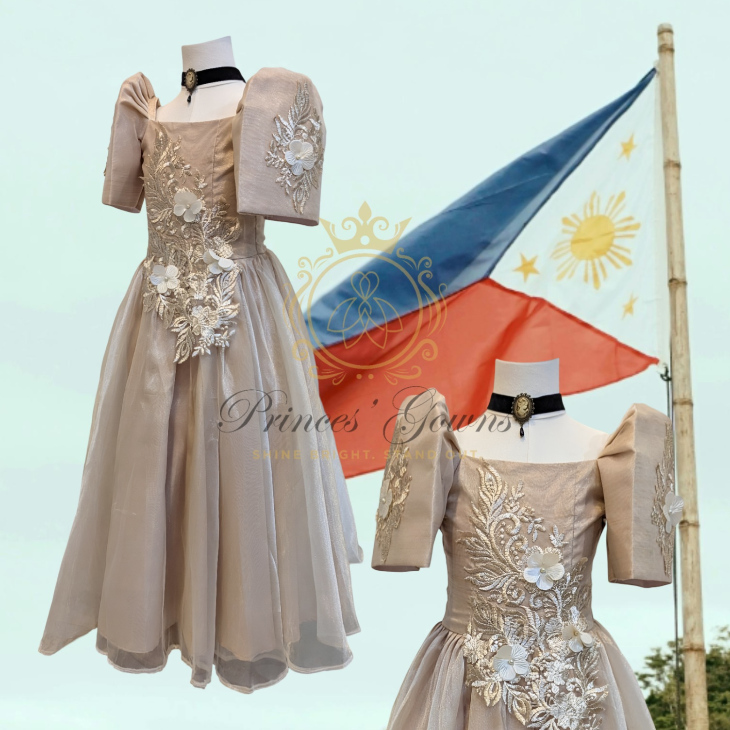Mocha Filipiniana gown for girls made from organza with lining, featuring Filipiniana sleeves, 3D embroidered flowers, and zipper back. Ideal for school programs, cultural events, and special occasions. Accessories not included.