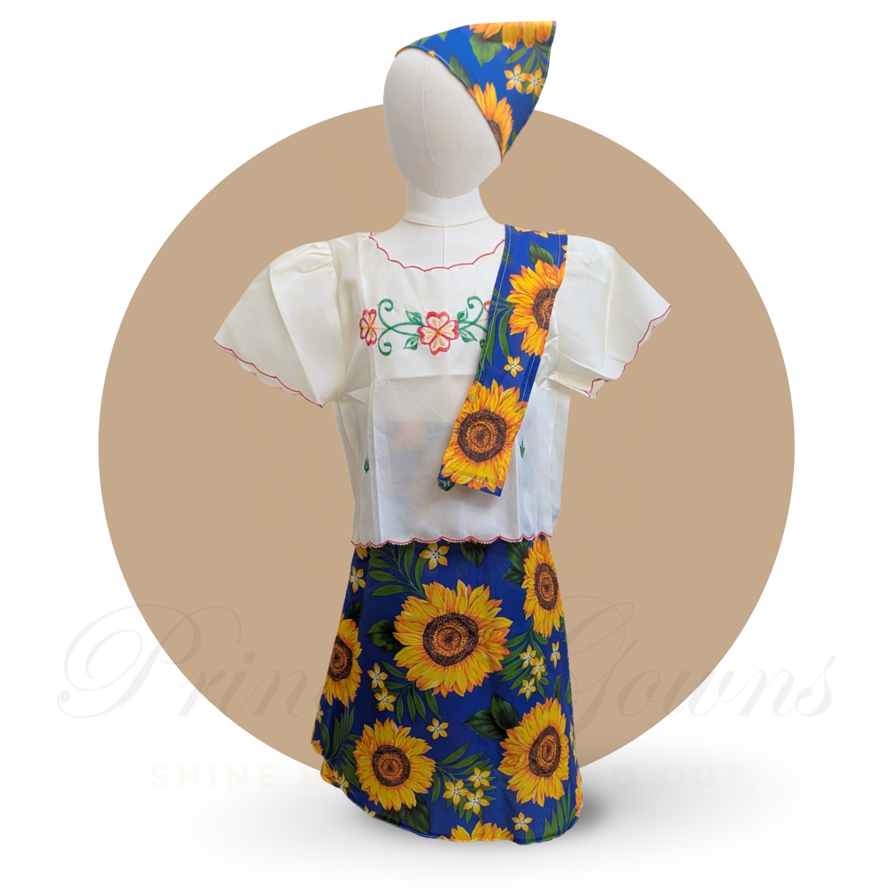 This Filipiniana Kimono set for girls features a white top with puff sleeves and a round neckline, paired with a floral blue wrap-around skirt. Made from soft cotton fabric, it provides comfort while keeping a traditional and modest look. The set includes a matching sash and headband, making it perfect for cultural performances, school programs, and themed celebrations.
