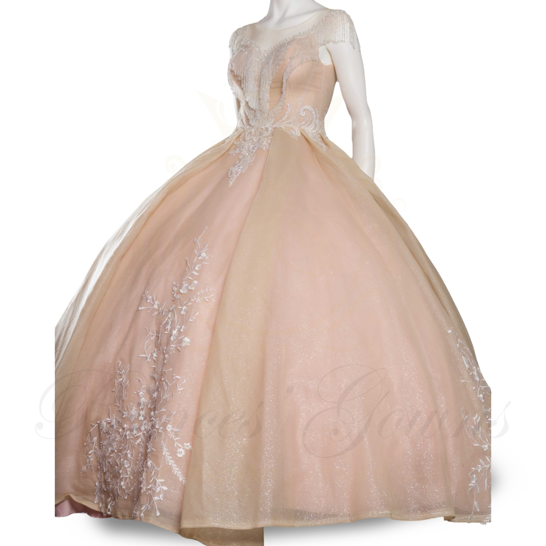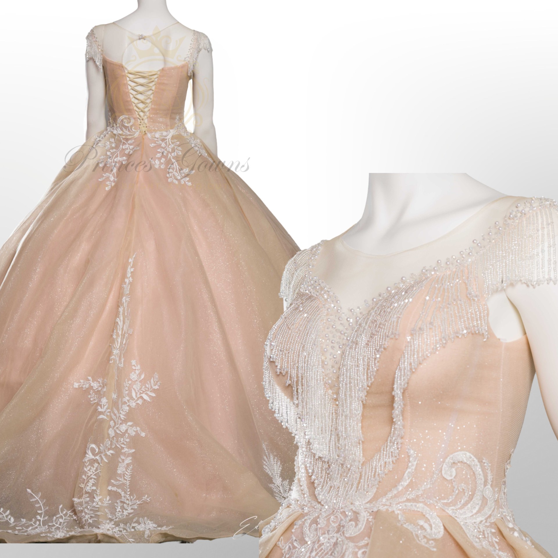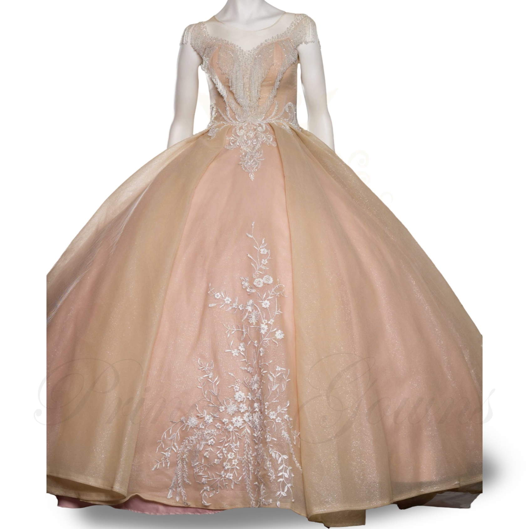 The mannequin is displayed wearing a 6-hoop petticoat for reference purposes only. The petticoat is not included with the garment but can be rented separately. Please be aware that the colour may appear differently depending on lighting conditions.